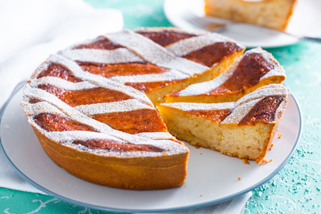 Stendere la pasta e foderare una teglia da crostata. Riempire con il composto di ricotta e grano. Utilizzare la pasta rimanente per creare il tradizionale motivo a griglia sulla superficie.
