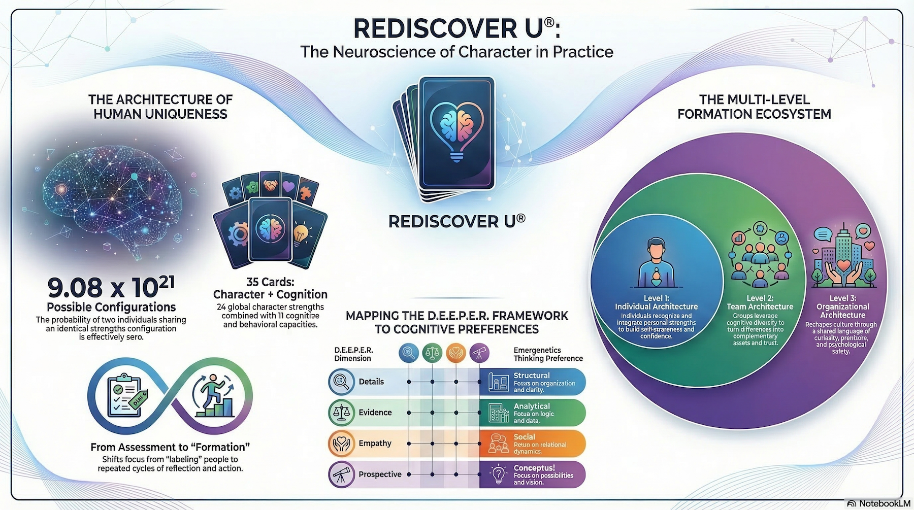 REDISCOVER U® brings this science into practice through a deck of thirty-five strengths cards that combine global character strengths with cognitive attributes inspired by social neuroscience and Emergenetics®. Through dialogue, reflection, and storytelling, participants identify the strengths that naturally energize their thinking and behavior. The framework helps individuals and teams move beyond traditional assessments toward developing deeper awareness of their unique constellation of strengths and how those strengths contribute to collaboration, leadership, and community well-being.